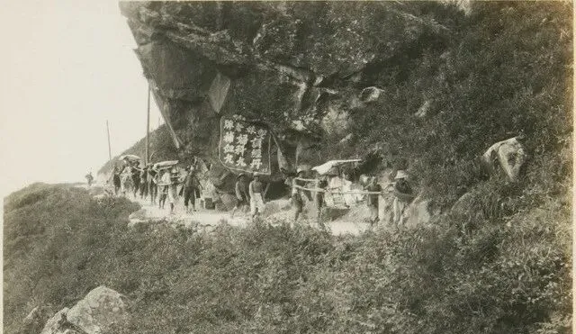 这条贴着峭壁的窄路上是一队肩挑的挑夫,扁担压得绳子发亮,步子齐齐的,走到转角处旗幡一晃,字就跟着山风抖,妈妈说那时候上山下山全靠人力,雨天路滑,鞋底抹油似的,可人家照样稳稳当当。