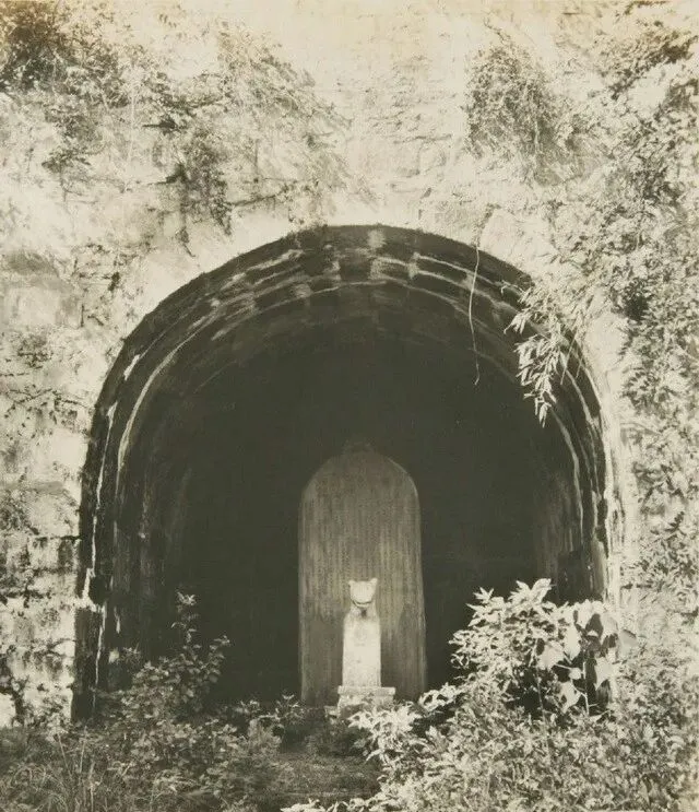 这个深黑的拱洞里立着一通石碑,前面蹲着一只小兽,洞口周围的石纹一圈一圈像年轮,藤蔓顺着砌缝垂下来,安静得有点发慌,你站在洞口,凉气就贴着脚背往上窜。