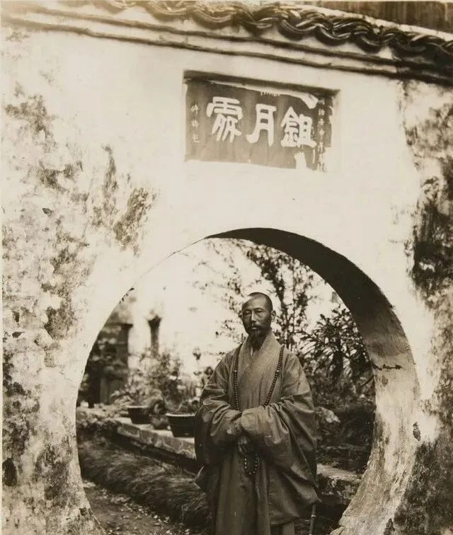 这个圆洞门前站着的是位山中僧人,身上披了旧袍,手里绕着佛珠,门额挂着匾,字被岁月熏得发暗,他看镜头的眼神很平,很稳,像在说,山里冷也好热也好,心里自有定数。