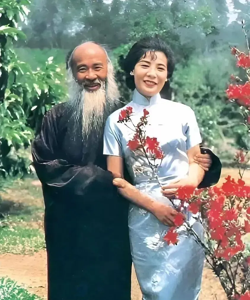 图中这对儿,老者身披深色长袍,胡须长得像一袭瀑布,旁边的小青衫笑得春光一抖,这个场景叫一老一少同框,颜色嫩得发亮,花枝红得正好,手臂轻轻一挽,亲密又不逾矩,老辈人常说画画的人最会摆姿势,这一站一靠,画面就有了骨架和气口,放在今天看也不显做作,反倒像一张随手拍的生活照。