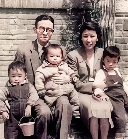 这一幅叫庭前全家影,男人细框眼镜,身量消瘦却坐得直直当当,女人揽着孩子,嘴角准备笑还没笑开,三个小家伙穿着厚棉服,像三个小团子,左边那位手里攥个小桶,估计刚玩完土,砖墙作背景,藤蔓顺着缝隙垂下来,光在墙面上烤出一层暖气。