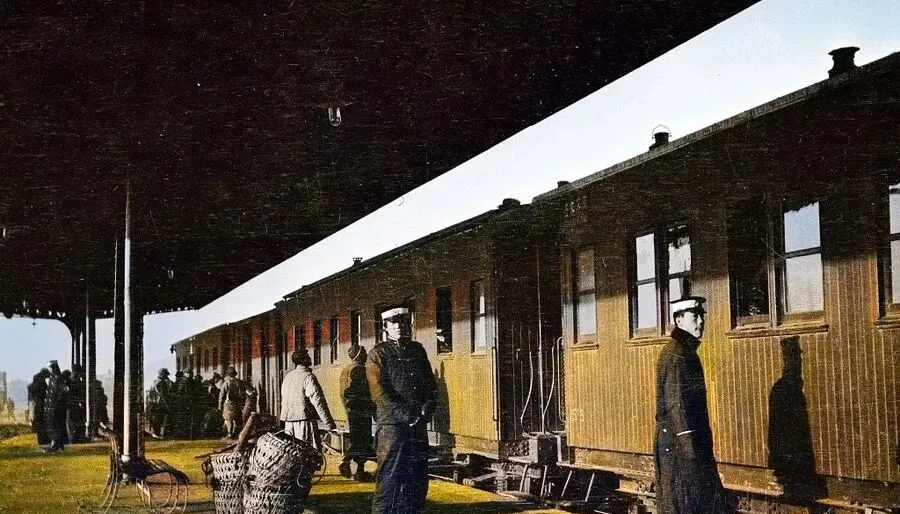 这列车厢叫木壳车,窗框一道一道,油漆被风刮得发灰,站台檐子压得很低,阴影像一块巨大的幕布,穿制服的站务员在边上巡,看得出忙里带稳,竹篓靠着柱子,旅人们把披风裹紧了,冷风从车底穿过来,脚后跟不由得跺两下。