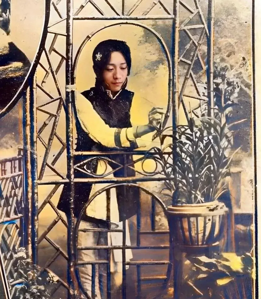 这张叫倚栏小景,铁艺格窗叠出好几何形,圆的方的都来凑热闹,女子把手搭在栏上,袖口一圈淡黄的滚边,把肤色衬得透亮,画面像影楼底片手工上了色,黄调压着,黑线挑着,盆栽在一旁正抽新叶,泥盆口沿磕了一道口儿,挺生活。
