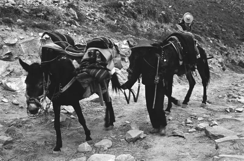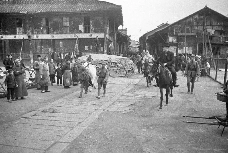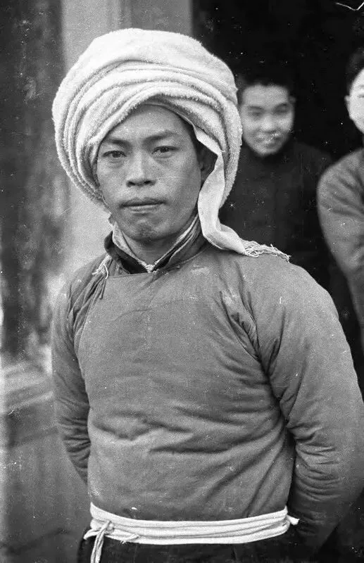 清末老照片:地主出行家丁沿途警戒护送,挑柴老汉,清军弓箭手,搓麻绳的妇女,盐贩子称盐