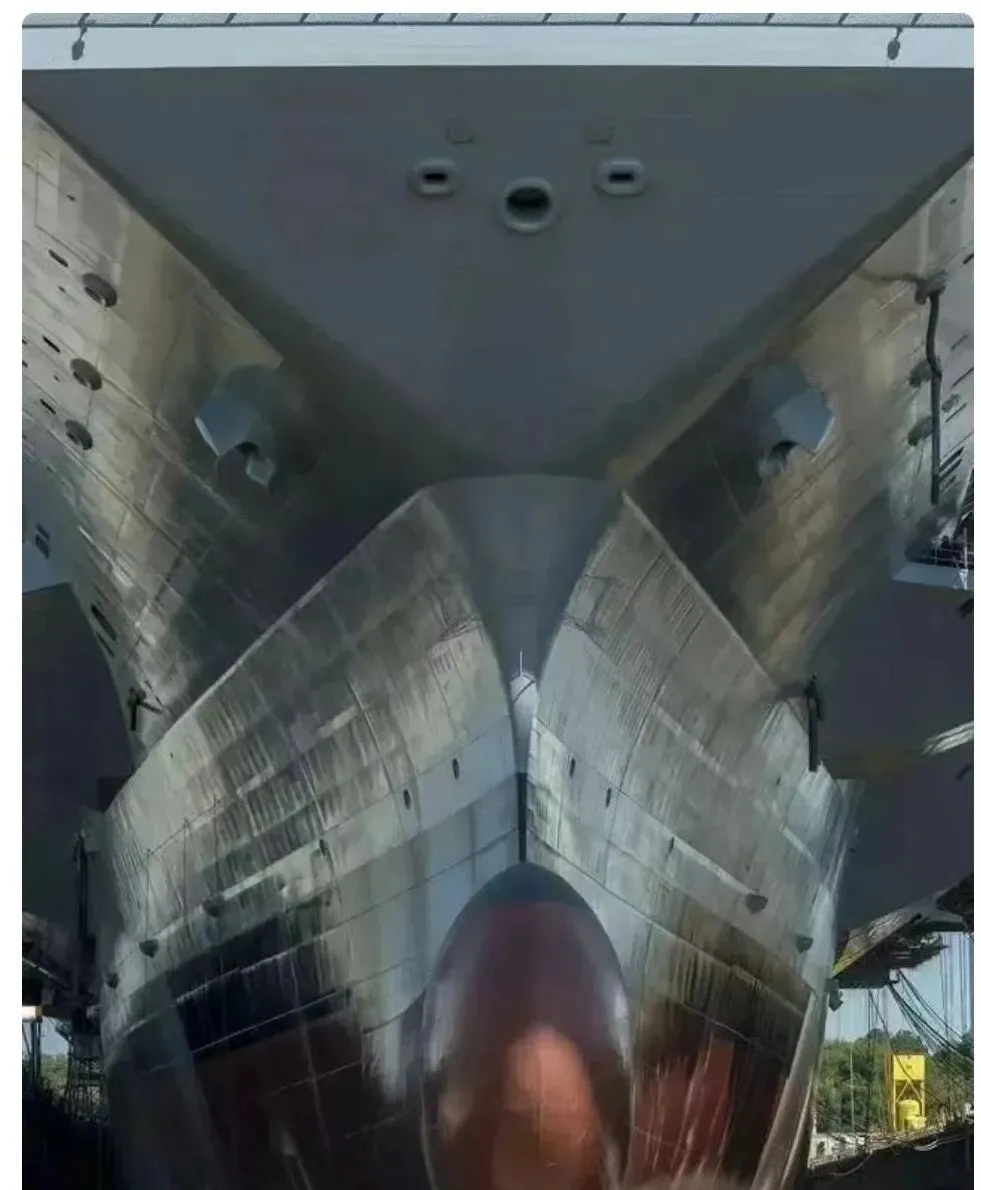 图中这庞然大物叫核动力航母的舰艏近景,灰黑甲板压下来像一把巨斧,船体钢板带着油亮的反光,球鼻艏鼓着红褐色的肚子,一眼看去像一头沉默的鲸,站在船坞下的人渺小得像蚂蚁,现代工业的尺度感,就得这样硬生生给你量出来。