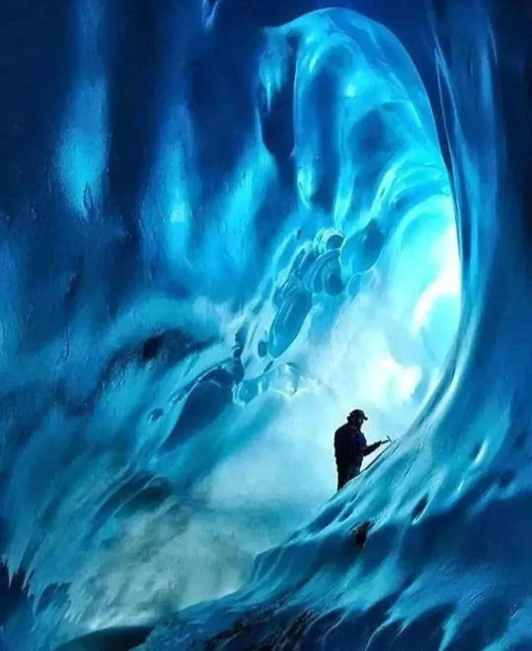 这个蓝得发光的地方叫冰岛瓦特纳冰原的蓝冰洞,冰壁像玻璃又像水母,手电照进去一层一层的蓝晕,人在里面只敢小声说话,冰缝里会回一口冷气,抬手摸上去,指尖立刻发麻。