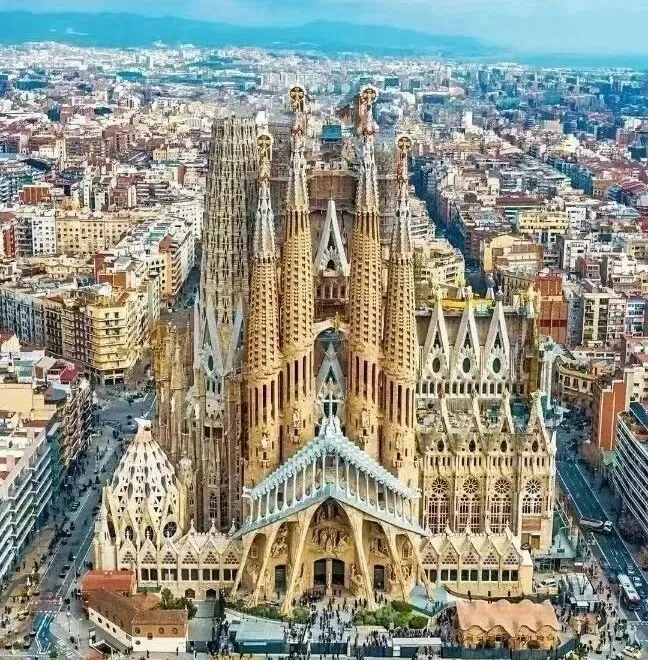 这个高耸的家伙叫圣家族大教堂,塔林像一束竖起来的风铃,立面密密匝匝全是雕刻和窗花,阳光一打,石头像会呼吸,高迪没等到竣工就走了,现在路过它,还是要抬头很久才看得全。