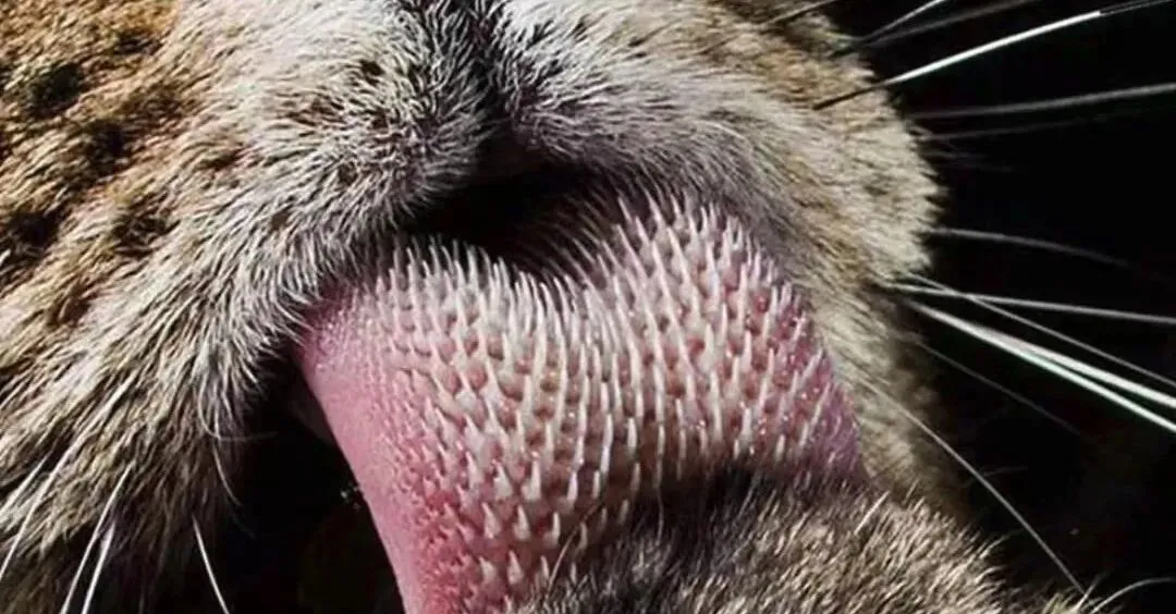 这张近距离的照片是猫科动物的舌面,满满的倒刺像细小的梳齿,舔上去别说皮肤了,牛皮都能刮下一层,小时候被自家猫挠完再被它安慰似的舔两口,疼是疼,却也不舍得推开它。