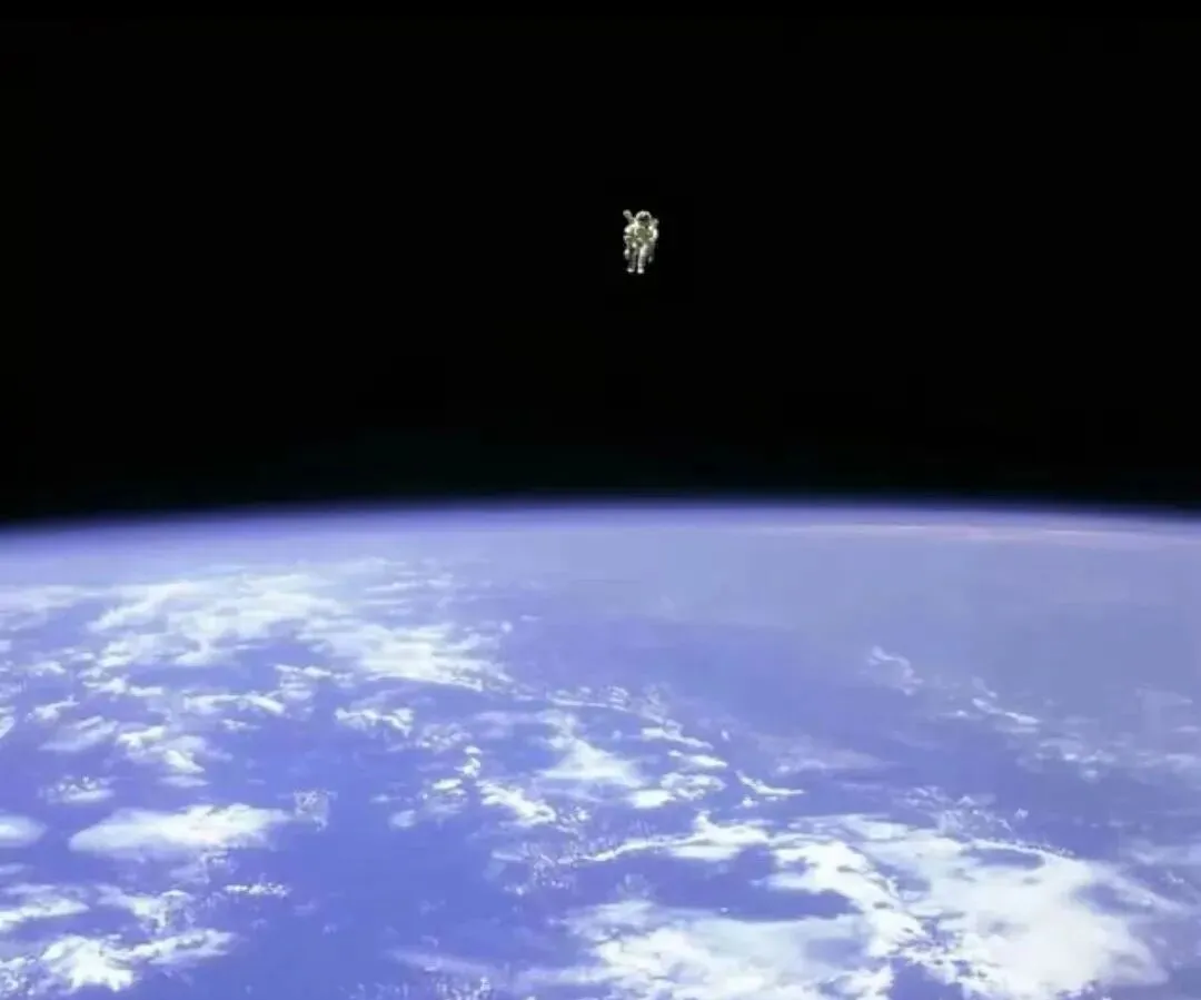 这张小点点在黑幕里的照片,是不系安全绳的太空行走,地球半边蓝得像擦了油,宇航员像被挂在幕布上的一颗钉子,那一刻隔着屏幕也替他捏把汗,孤独和勇气都写在画面里。