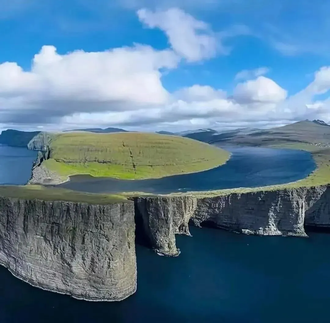 这一条像被天刀削过的断崖边上,趴着的就是法罗群岛的海上悬湖,远处海浪打石崖,近处湖水一汪平,风把草吹成顺毛,站在边上,不自觉就想往后退半步。