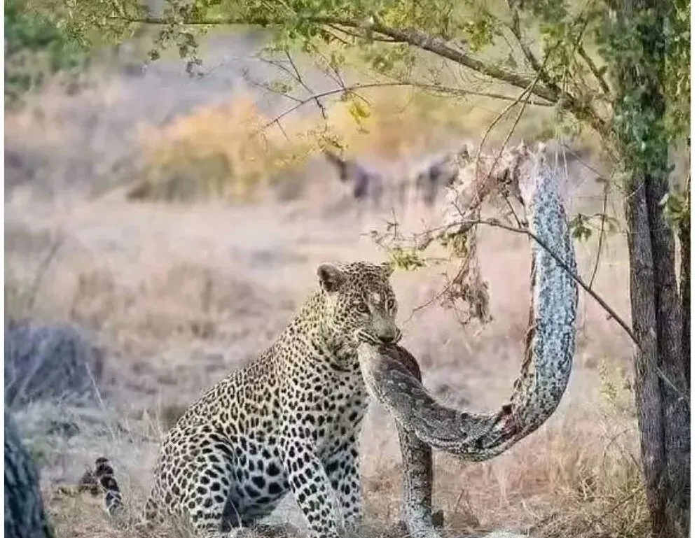 这场对峙里,花豹叼着非洲岩蟒的身子,树叶被风一拨一拨,尘土贴地滚,蛇的花纹还在发亮,荒原就是这样,强者没空废话,赢的人也会带着伤疤走远。