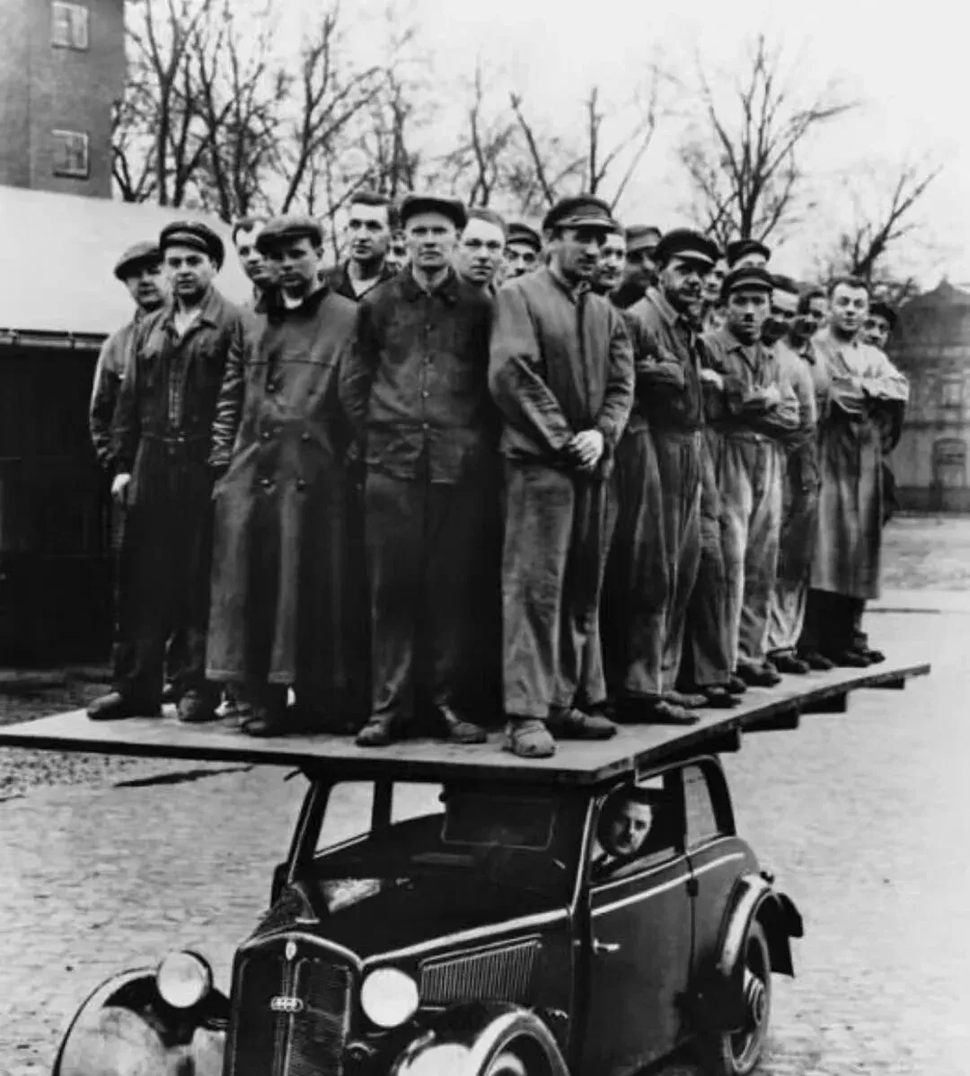 黑白照片里这操作叫车顶承重测试,一群工人稳稳当当站在奥迪920车顶,底下小车却没塌半分,当年造车讲究扎实,爷爷看见这张照片只念叨了一句,老时代的钢铁,是能靠的。