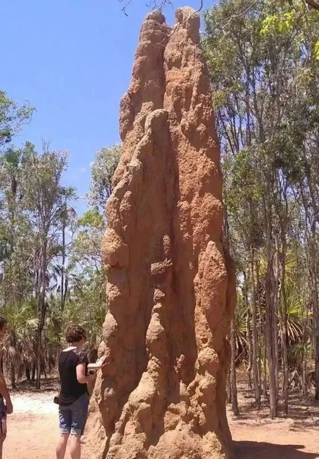 这根通天柱似的家伙,是北澳的白蚁丘,表皮糙得像风干的馒头,热风一吹沙子就哗哗往下掉,人站旁边只到它的膝盖,别小瞧了白蚁,泥巴握在它们手里,能堆出一座楼。