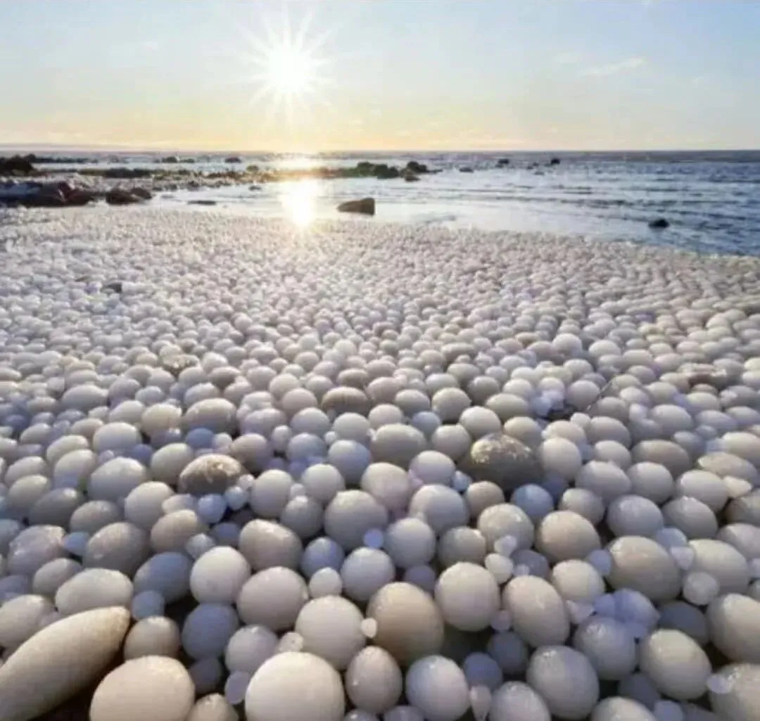 这片铺满鹅卵石似的圆球,叫冰蛋,只有极冷的海边才会磨出来,浪把碎冰翻来覆去打,边角都被搓圆了,踩上去咯噔咯噔响,太阳一照,每一颗都冒着幽亮的光。