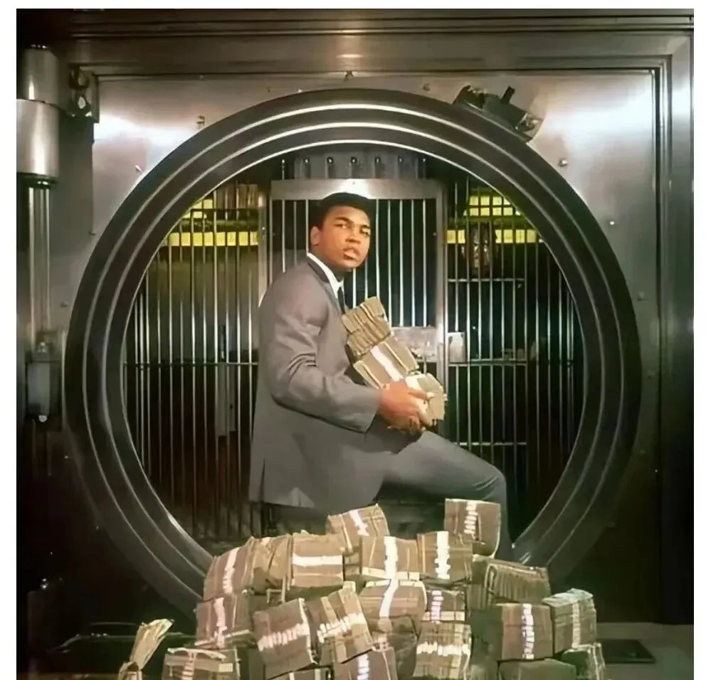 这张在金库门口抱着钞票的,是真实的领奖时刻,厚厚一摞一摞砌成小山,合影留念的不只是钱,更是拳台上一拳一拳攒下的汗水,年轻时候看这张,只觉得壕,现在看着,先想到背后的刻苦。