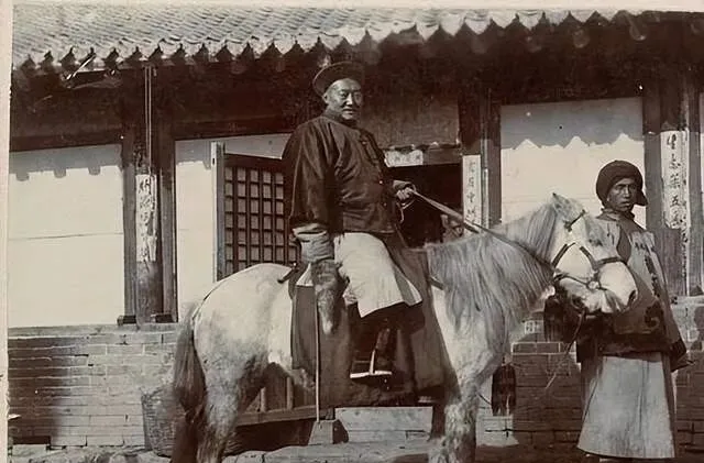最后这张最热闹,院门口一位骑着马,衙役牵着缰绳站侧边,马背那套硬邦邦的是木鞍,前后鞍桥方方正正,裹了皮,脚蹬是铁的,踩上去冰凉,役差手里的细长杆是马鞭,杆身韧,末梢细绳一甩有声,出门拜票迎送差事都少不了马,爸爸说他小时候见过邻村还留着一副旧木鞍,冬天摸着冷得手缩,现在公事坐车打表,马鞭成了摄影棚里的道具。