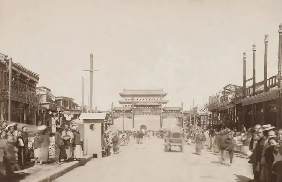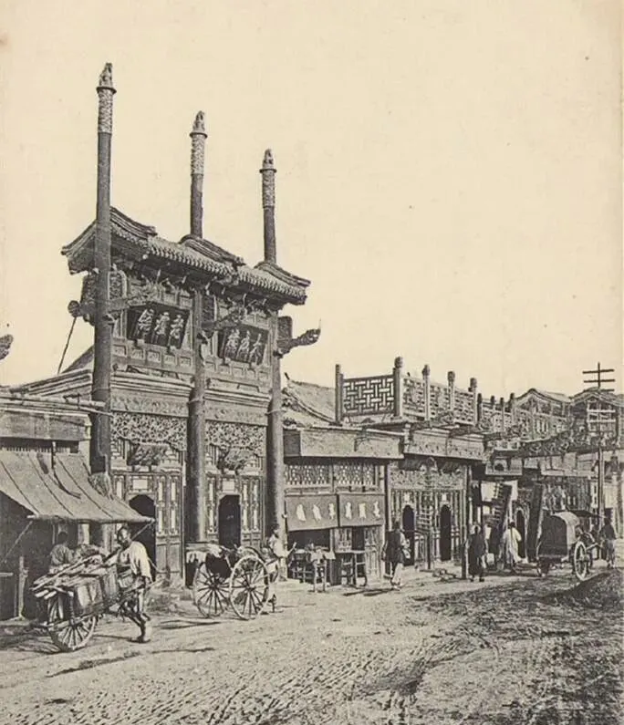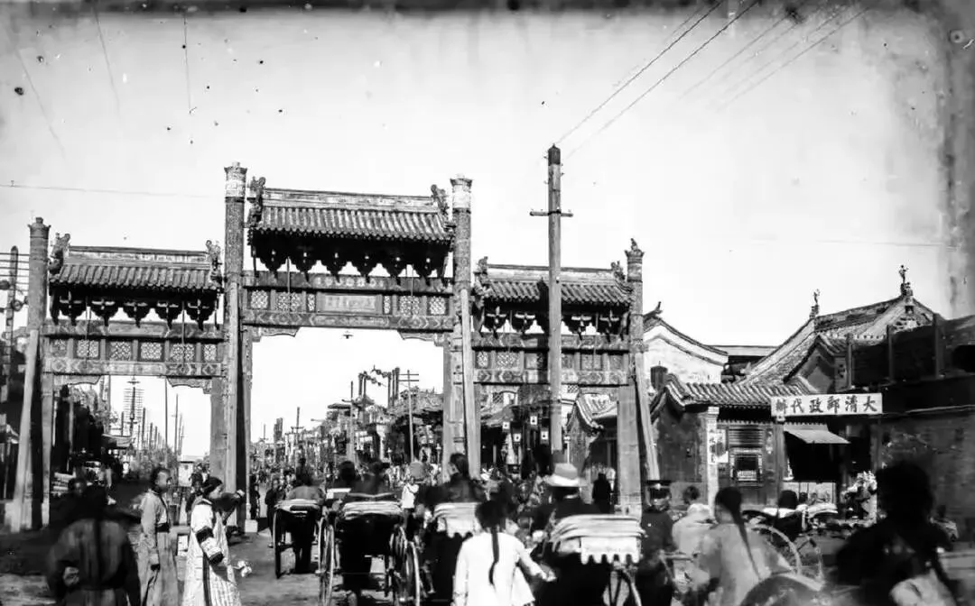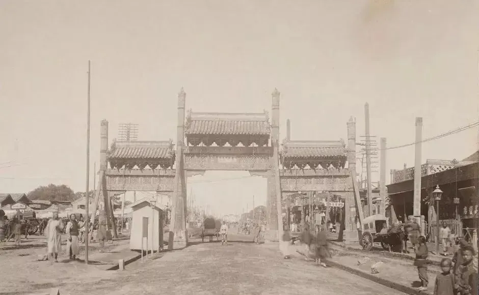 这座牌楼旁边立着电线杆子,新旧搁一处,轿夫和黄包车擦肩而过,时代就在这条街口打了个照面,现在我们看电线嫌碍眼,那时人家还当稀罕物呢。