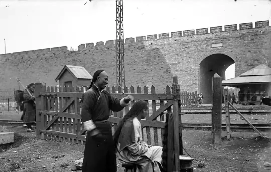这个扎着长辫的叫辫发,理发匠拿一把钝剪慢慢修,顾客坐在小马扎上不吭声,边上是铁皮水壶,烧得咕嘟响,师傅说别动,咔嚓一下,辫梢就齐了。