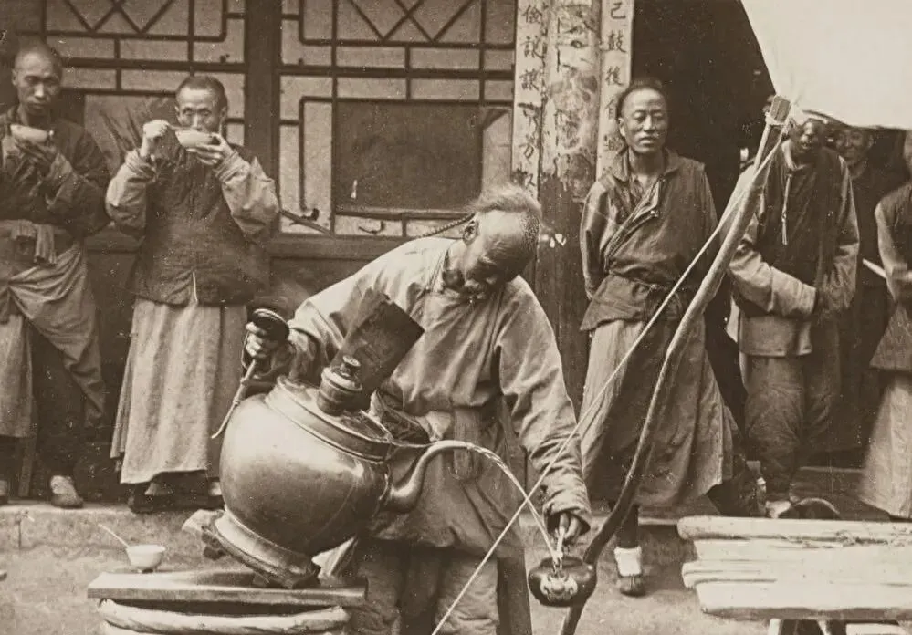 图中这只大铜壶叫开水壶,壶嘴长得能探过半张桌,掌勺的一俯身,沸水划一道弧,落进碗里正好七分满,茶客不抬头,先吹一口再抿一口,像捧住了这城里头的热乎劲。