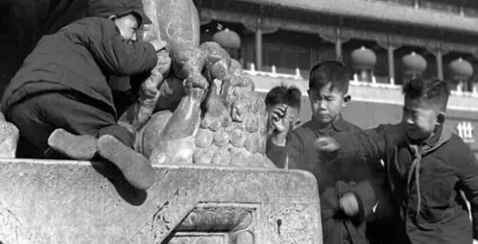 图中孩子正往石兽上凑,袖管里包着炮仗,冷风里脸蛋红扑扑,谁抢火摊谁是英雄,那会儿家里一句话就管用,别凑太近,炸坏了新手套还得你自己缝。
