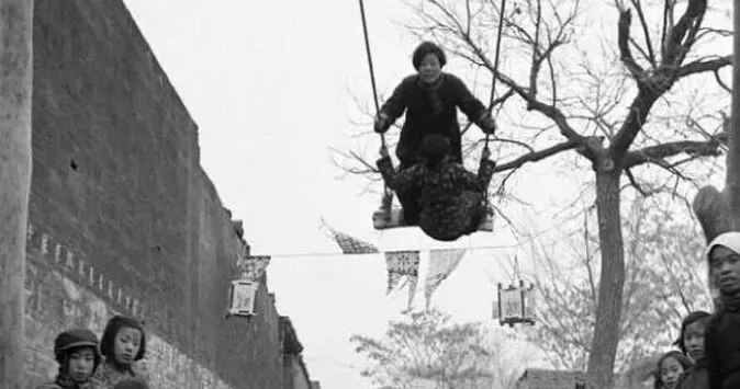 这个长杆子绑着木板叫秋千,绳子吱呀一响,人就飞出墙头了,下面的人伸手接着,笑声被风掰成一截一截,小时候我也试过,脚尖一抬差点碰到灯笼。