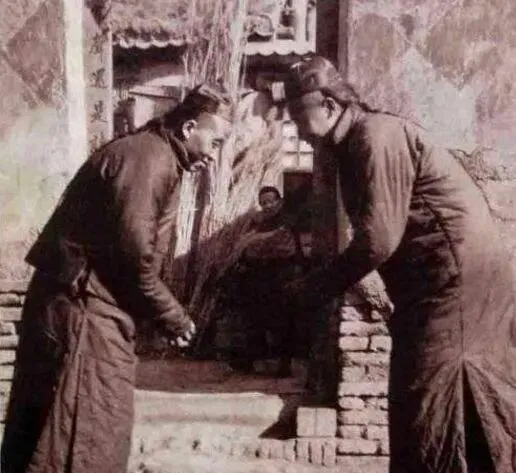 两位穿长袍作揖,这叫见面礼,手一抱身子一俯,话不多,诚意全在动作里,院门口的扫帚靠墙立着,显然刚把门口的霜扫净,等福气进门。