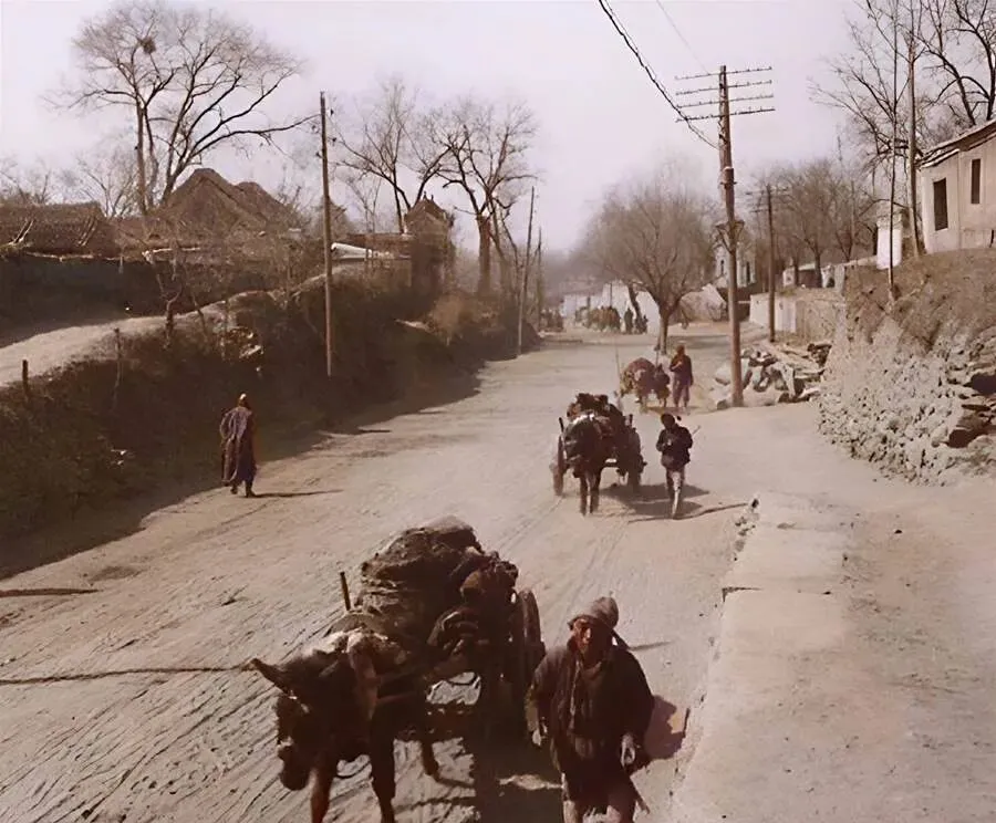 图中这条土路上跑的,是靠驴车吃饭的货运人,木轮车轴吱呀作响,车辕上缠着麻绳,篷下压着整捆的柴货和粗布包裹,男人一手提鞭一手扶辕,嘴里还嘟囔着别晃散了货,奶奶说那时候走一遭得半天,现在卡车一脚油门就到了。