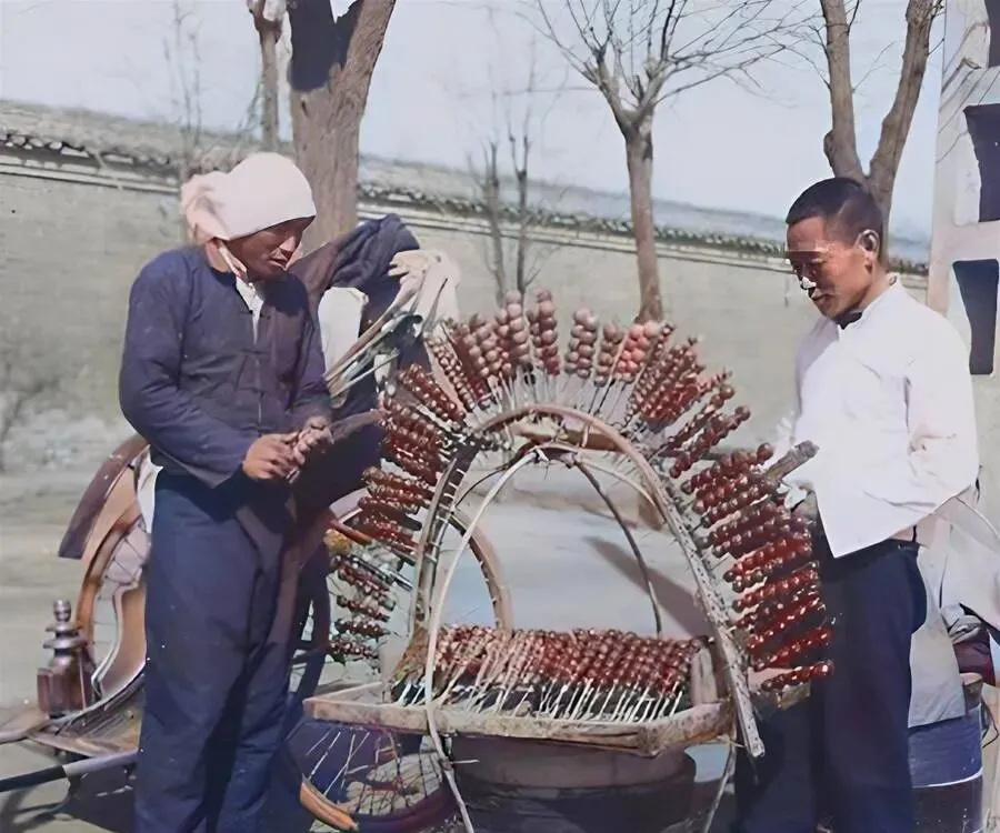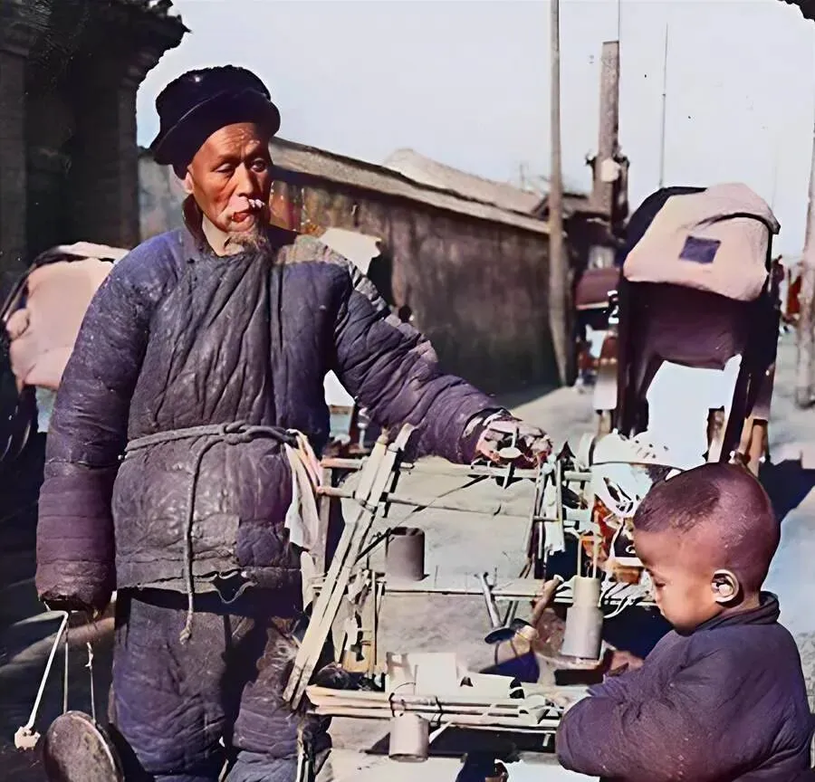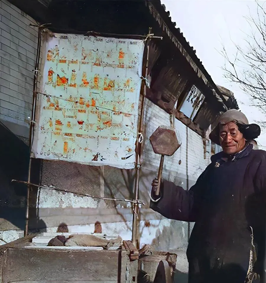 这个举鼓的叫糖客,六角拨浪鼓一晃,咚咚两声,孩子就围过来了,手推的小木车上摆的是黏牙的江米条和芝麻片,鼓面后搭着一块手绘招牌,颜色早被风吹褪了,可那口甜味,真能把人从胡同口勾出来。