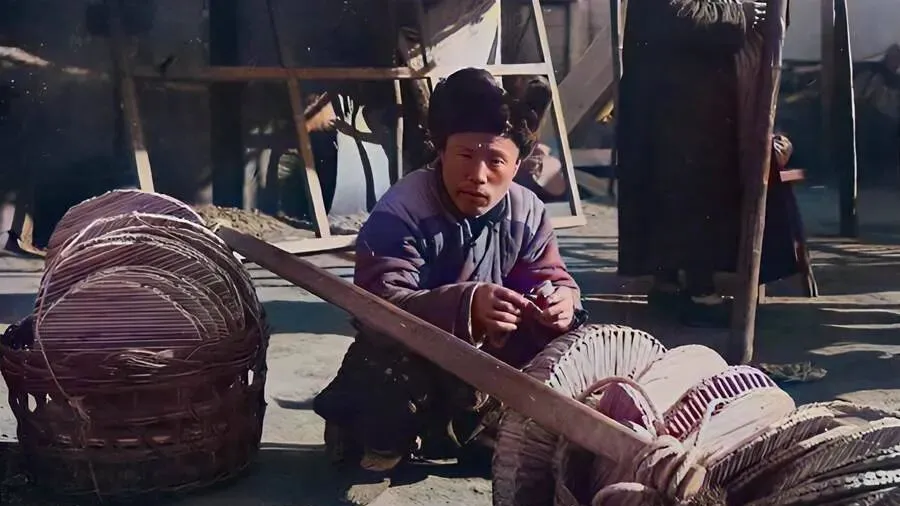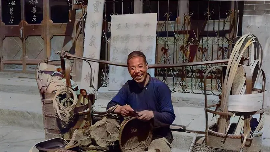 这位笑得见牙不见眼的,是修柳编的手艺人,身边堆着一溜柳条坯子,刀片沿着筐沿咔咔走,裂口被一条新篾勒紧了,奶奶说当年顶多花个十来个铜子,破筐又能扛一年庄稼。