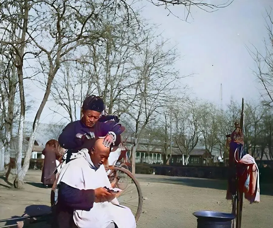 树下这位肩背木匣的,就是游街理发的师傅,白布一围,刮刀在头皮上轻轻走,水盂旁边杵着一根旗杆样的家伙,好找人也好立面子,父亲说他年轻时就让这种师傅推个干净头,凉快又利索。
