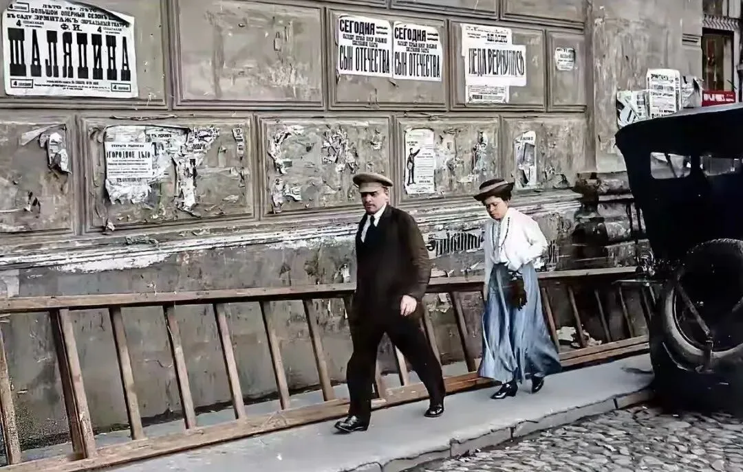 图中破旧的灰墙上贴满了撕扯过的告示,木质的长梯横卧在路边,鹅卵石路面亮汪汪的,男人戴呢帽穿深色西装,女人挎着手套裙摆微拢,步子急而不乱,镜头像被他们闯过去一样,小时候我跟爸走旧城墙根儿,最爱念墙上的字条,爸总敲我脑门说别瞎看,真正的消息在人的脚步里。