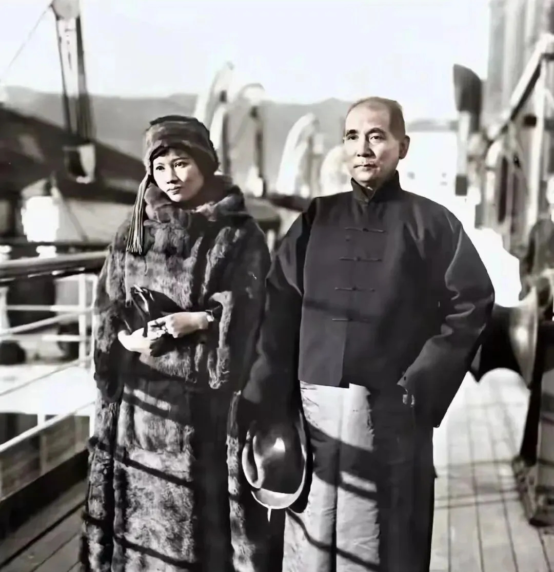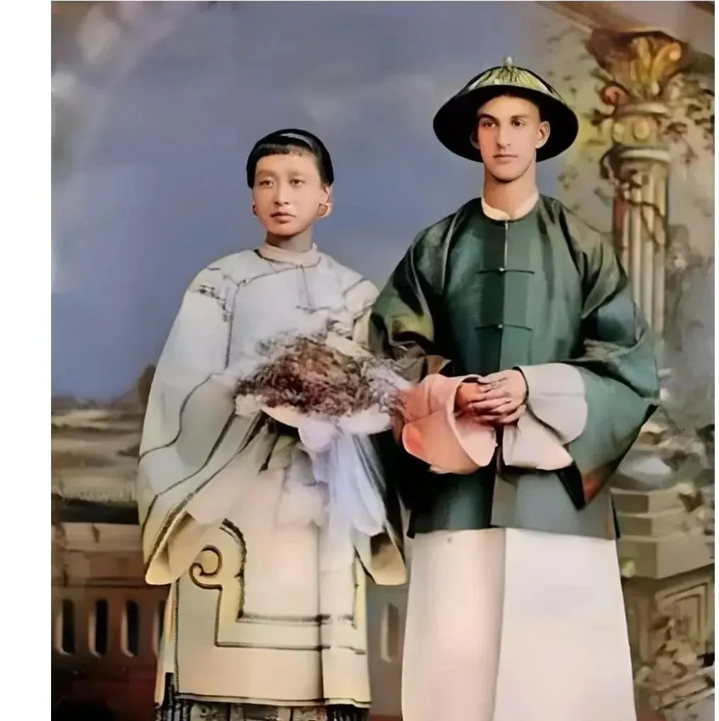 这个彩色的老婚照衣纹很美,新娘衣摆上有宽边纹路,新郎的长衫绿色带亮,帽檐压得很正,手里指节修长,背后是手绘柱子和远景,老相馆就爱这么画,镜头前站稳了,故事就从此开始,以前婚礼没那么多花哨,一身衣裳就是一辈子的誓词。
