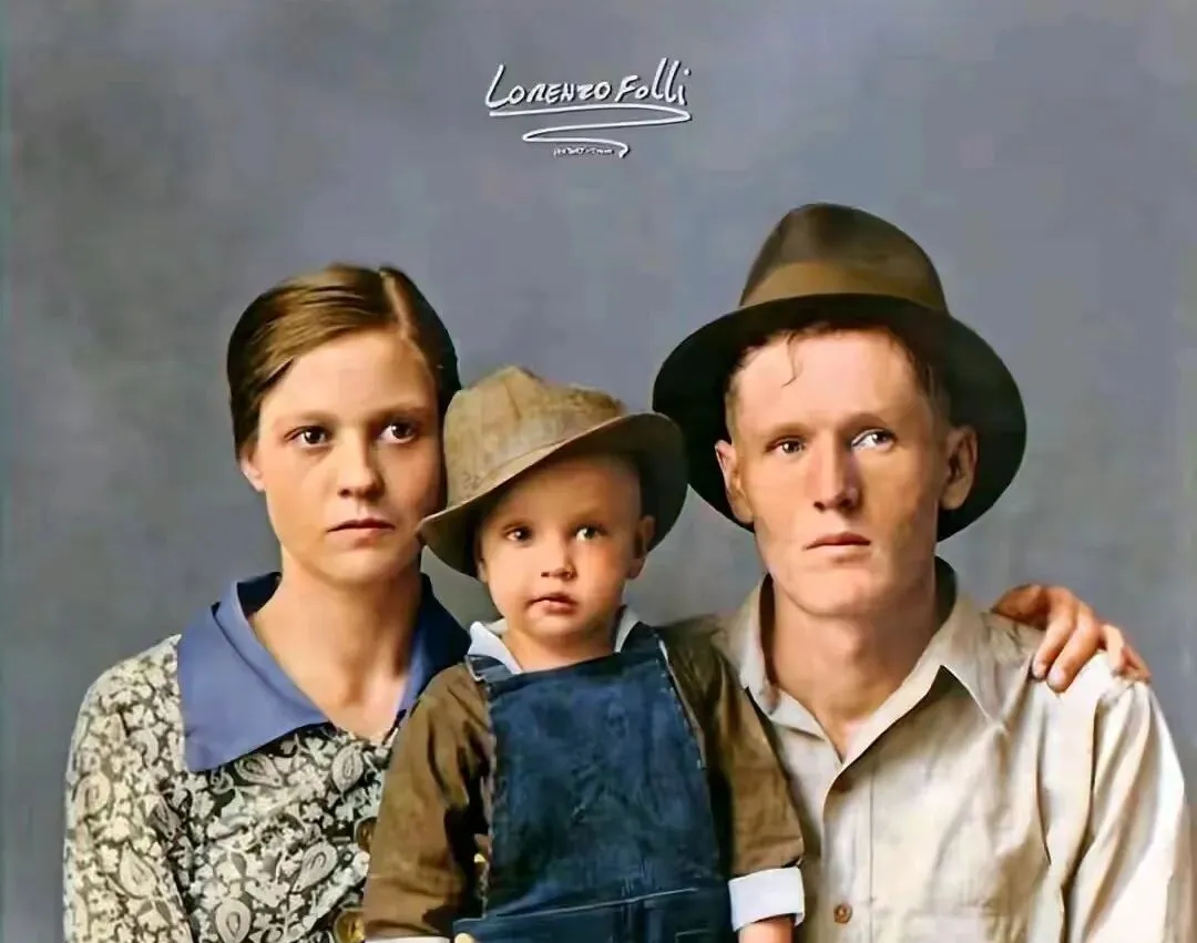 这个三口之家眼神都往镜外看,父亲的草帽压低了额头,母亲衣领是碎花的,孩子戴着歪斜的小帽,蓝色背带裤鼓起个口袋,照片有种土色的厚重,像刚从玉米地里走出来,我听奶奶说那时相片难得,表情都舍不得浪费。