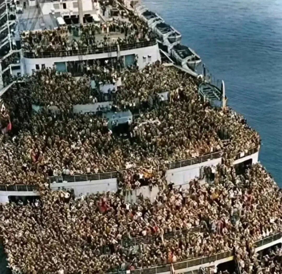 这艘船甲板上挤得密不透风,层层甲板像蜂窝,都是人,几乎看不到白色甲板了,欢呼的手臂连成一片,假如你把耳朵贴近这张照片,能听到嘶哑的口号和口哨声,爷爷讲过他在码头等人的滋味,等的是船影,也是命运转弯的一刻。