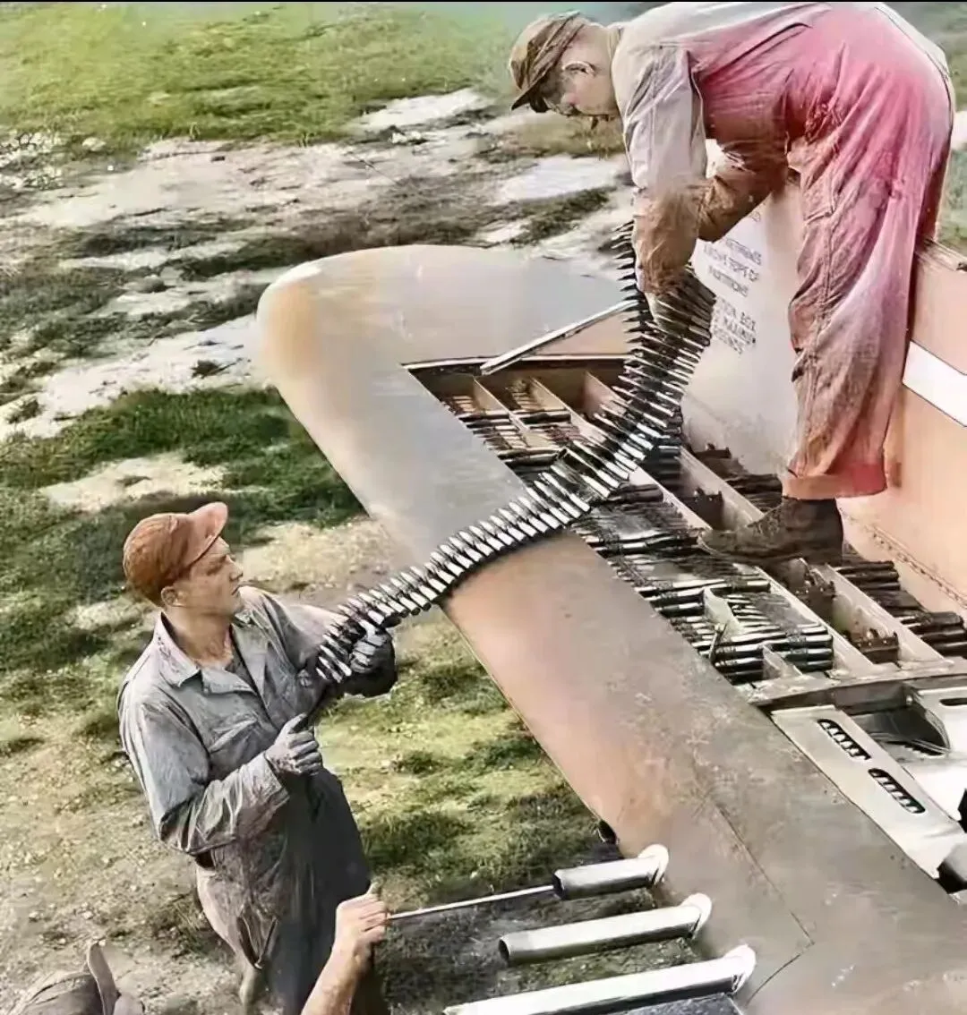 这个画面最扎眼的是像黑色长蛇一样的弹链,工兵把它一节一节压进机翼里的弹仓,袖口都是油渍,草地泥点子溅在鞋上,另一人手里的金属杆正对卡位,节奏很快但手很稳,这种照片一看就知道是“马上要飞”的紧促气息,以前上学做劳动课时我系螺丝总拧滑,师傅火了说,手要慢,心要快。