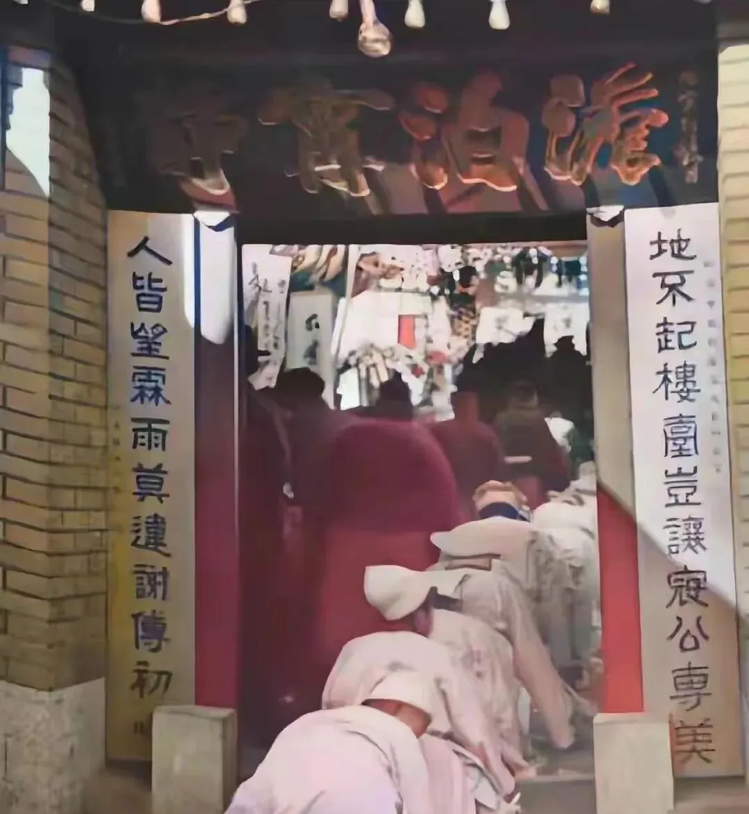这张在门楼下取的景,匾额金字发暗,青砖两侧贴对联,门里灯串微亮,一排素服的人从门外一路叩进去,后背起起伏伏,像一条白浪涌向堂前,乡下老屋的礼数就是这样,既慢又重,人心服了,脚步才放得轻。