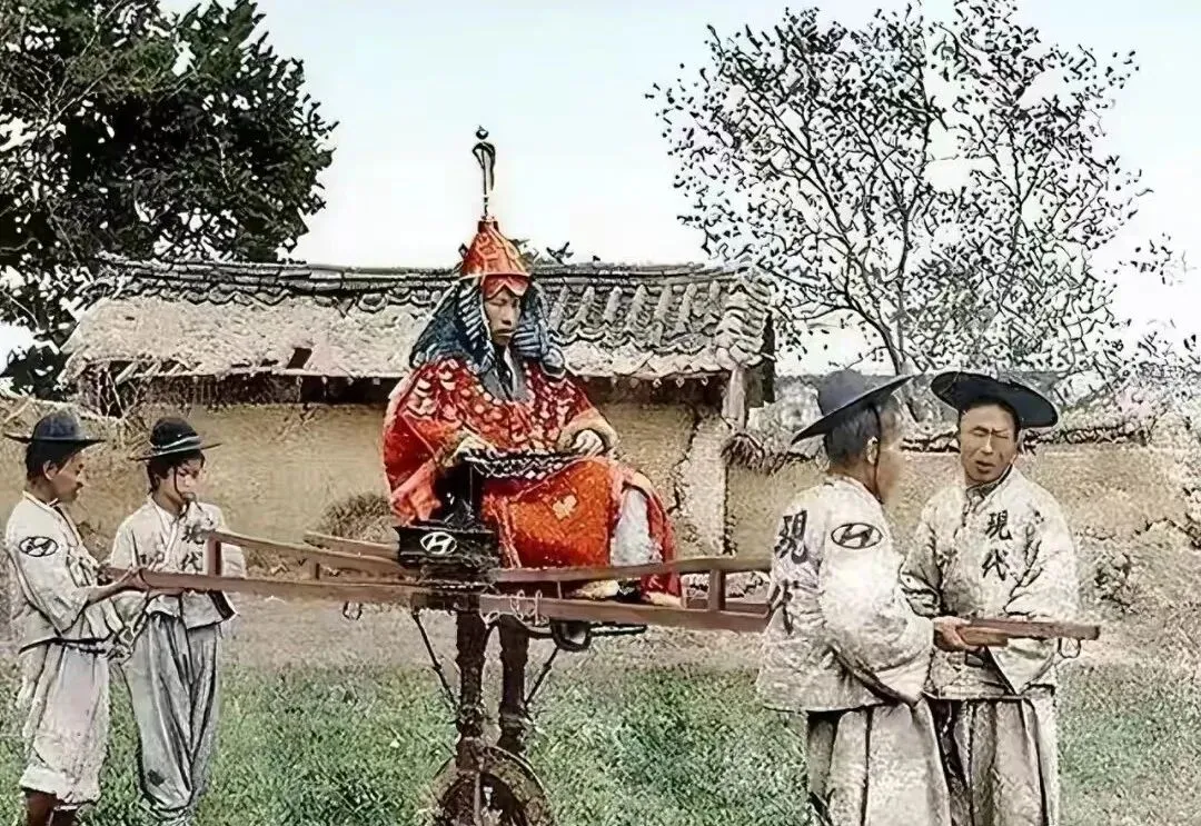 这个可有意思,前头像轿杠,底下却是一只独轮,轿座上大红服饰的人坐得端着,但你看抬杠的肩头,微微用力往上一拱,生怕一歪,乡间的主意总是土法上马,能用就行,稳当才是王道。
