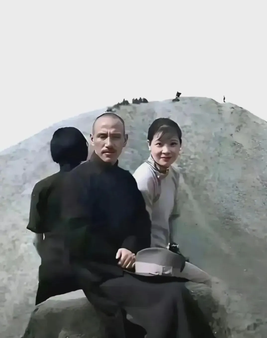 这张取景很简洁,远处是土灰的陵丘,近处一块石雕像鱼,男女并坐,男的手里按着帽沿,女的微微探身回头,笑里带点顽皮,风从她颈边绕过去,衣角轻轻扬起,导游在旁边小声叮嘱别乱爬,我们小时候也是拗,越让别动越想上去坐一坐,历史离得近了,人反而愿意笑。