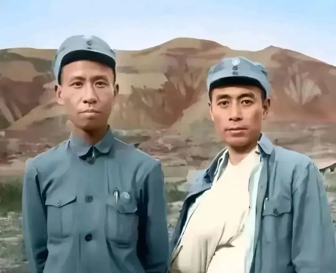 这个画面干净,两个人的军装统一的灰蓝色,浅檐帽,纽扣排得直直的,背后是起伏的山岭,光线把脸部轮廓切得很清楚,一个嘴角微挑,一个抿直了线,什么都没说,可你知道他们正要出发,我外公看兵照总会把背挺直,然后轻声说,好男儿就得这样站。