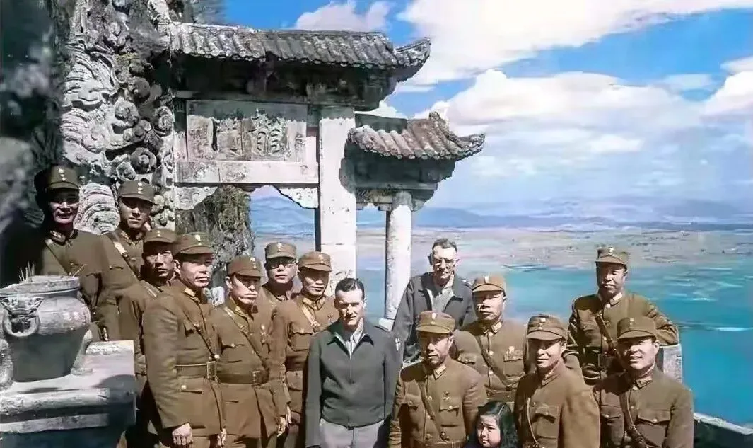 最后这张最热闹,石坊门额上刻着古字,纹饰像海浪往上卷,一群军装整齐的人站在门前,两个老外挤在中间,旁边还探出个小女孩的圆脑袋,身后是蓝得发亮的湖面和云影,阳光打在衣扣上发白,镜头像把风都一起装进来了,以前拍完照人群会散得很快,现在不同了,大家还要对着手机再补几张,时代变了,合影的心思没变。