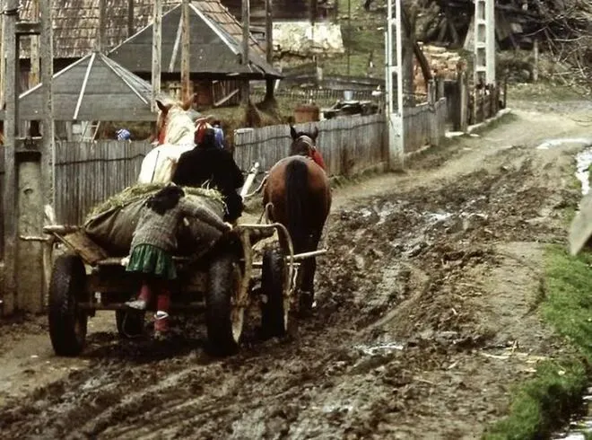 一辆马车驶过罗马尼亚的一条泥泞道路。当年罗马尼亚农村的道路,真的是糟糕得很。