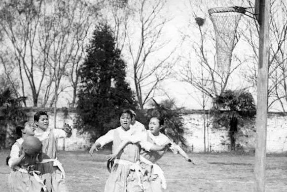 这个篮筐叫铁网篮筐,球是皮质的老篮球,民国女校的体育课真不含糊,瞧这投篮动作,抬臂、挺胸、手腕一扣,球划个弧线钻进网里,场边树叶哗啦啦作响,老师吹一声哨,队友在一旁高举双臂准备抢板,我小时候在操场看过学校的女篮校友赛,老前辈上来第一球就空心入网,台下齐声叫好,这身子骨的灵气,一看就是常年跑出来的。