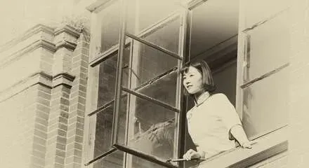 这个老式窗叫钢窗,细边框,外翻合页,拉手细长,姑娘探身望出去,肘压在窗沿上,校门口的梧桐影子被风一下一下地掀起来,那会儿的课间十分钟很宝贵,跑去饮水台接一杯水,顺手看一眼操场,看看谁在练队列,心里把下一节的默写默默又过一遍。