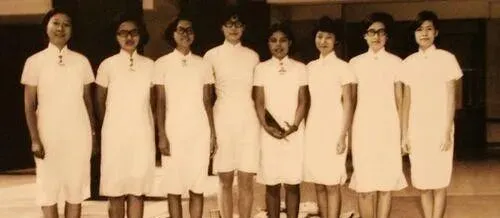 这个场景是毕业或开学合影里的经典队形,图中姑娘们穿的叫素色旗袍,白得发亮,中间夹一件格纹款,领口盘扣一字排开,袖子七分遮住手肘,身段不必收得很猛,讲究舒朗,妈妈看了笑说,以前拍照不摆夸张造型,站直,收下巴,眼神诚恳就够了,现在大家一见镜头先找角度,味儿是另一个味儿了。