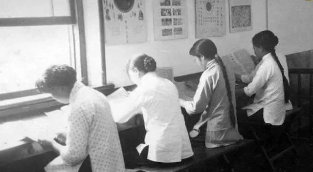 图里摆着长条凳和高案,这叫抄写台,靠窗坐四个女生,手里拿的是毛边纸和小楷笔,身子前倾,背后辫子压在衣领上,阳光晒在纸上发暖,写错一字不揉团,拿刀把轻轻一刮,纸屑落在案角,这种细火慢工的活,现在很少有人耐得住了。