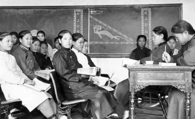 这块黑板上画着几何图和奔跑的鹿,这门课是几何与绘图合并的手工课,讲比例也讲线条,老师坐在木桌后,右手握着粉笔,左手压着教材,学生抱着练习册,腰背挺直,问题抛下去,后排先“咦”了一声,前排接住就回答,不是背诵,是当场想明白,那股子认真,透过照片都能闻到粉笔灰的味道。