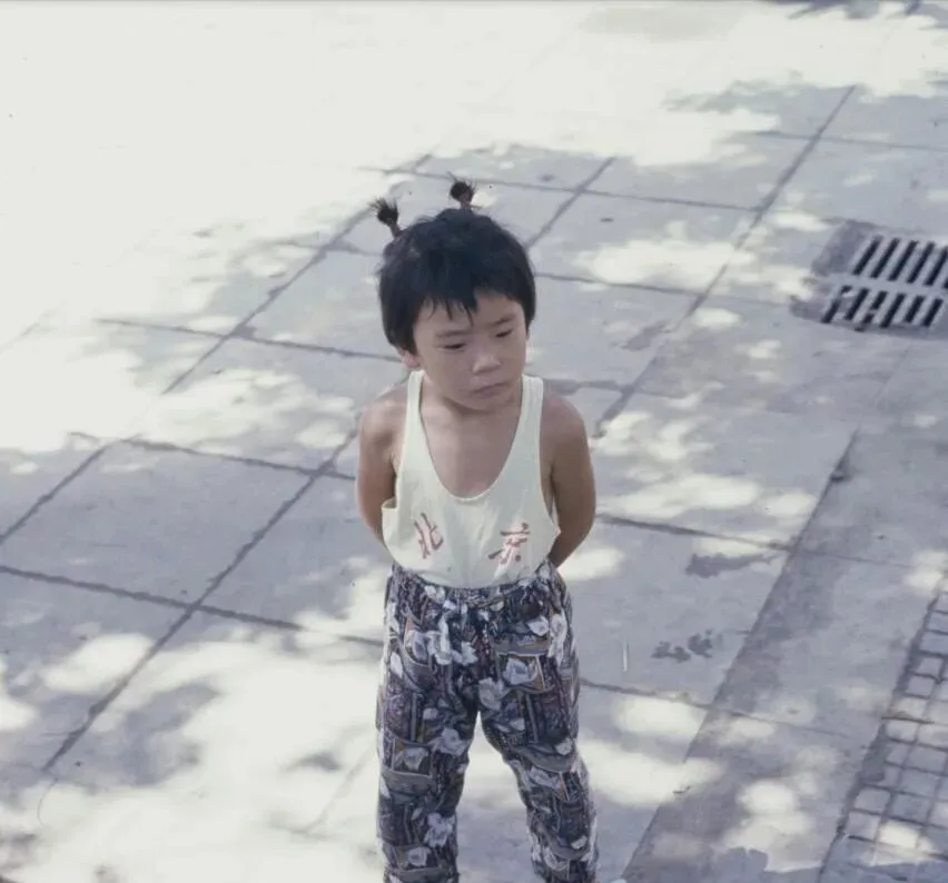 这个穿背心的小家伙叫胡同口的娃,背心上绣着两个红字,肥松松的花裤子用松紧带勒到肚脐眼上,头顶歪着两个小揪揪,太阳从槐叶缝里洒下来,影子一片一片落在地上,他背着手撇着嘴,像是在等冰棍,也像是被大人嘱咐别乱跑,站得直直的。