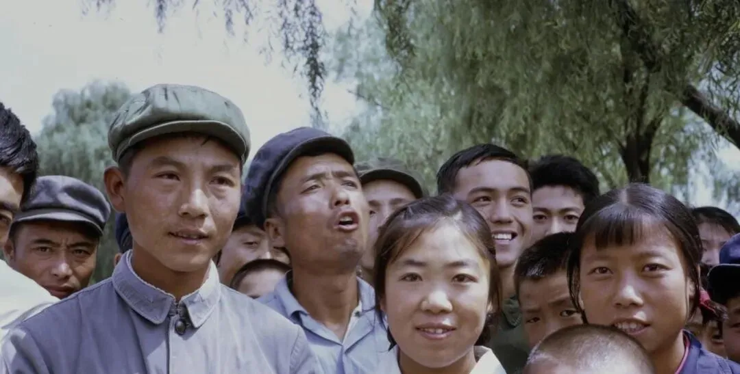 图里这一群人叫看热闹的邻里乡亲,帽子是布军帽多些,蓝灰色中山装和劳动布衫占大半,前排有人抿着嘴有人微微挑眉,像在听广播站的通知,也像在看马路对面出了啥新鲜事,表情有点紧又有点好奇,夏天的柳树在背后,影子把他们的脸切成明明暗暗的块儿。
