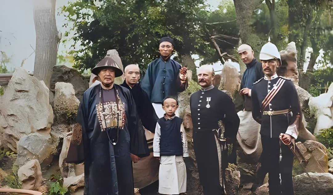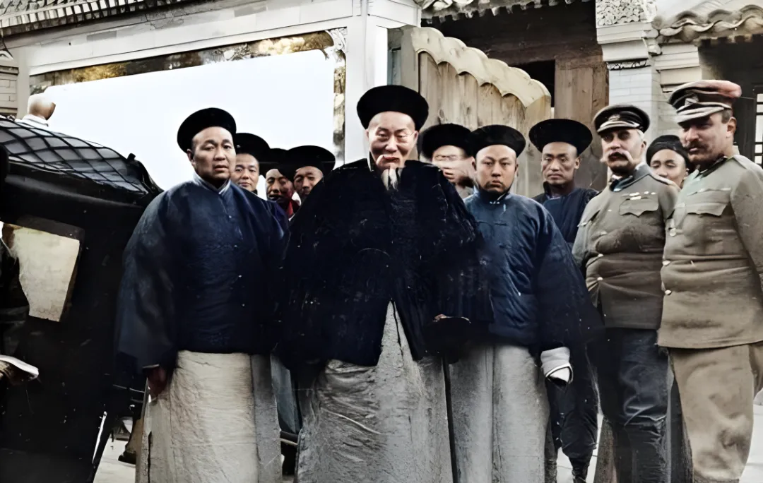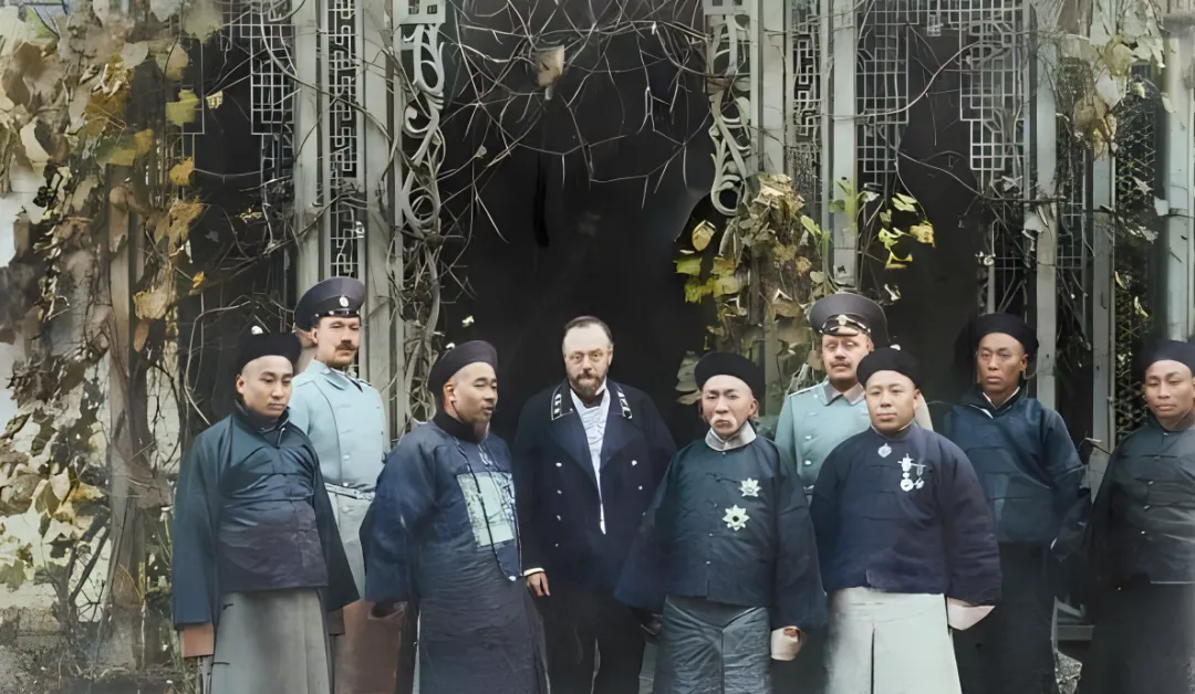 这个合影叫外交差使留影,洋兵皮带发亮,袖章一格一格分得清楚,中间的官员穿石青色长袍,胸前毛绒领子黑得发油,旁人都往他身上聚,像月亮边的星星。