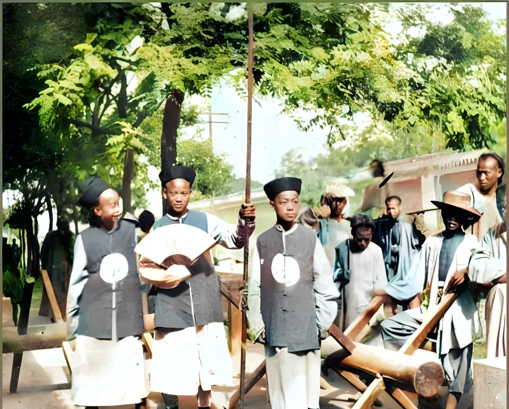 图中执长杆的小伙子们穿黑坎肩,胸口一个圆白标,腰间挂荷包,后面木凳横七竖八,像临时集合的点名场,树荫压下来,光影把脸切成明暗两半,年轻气盛的劲儿从眼神里蹦出来。